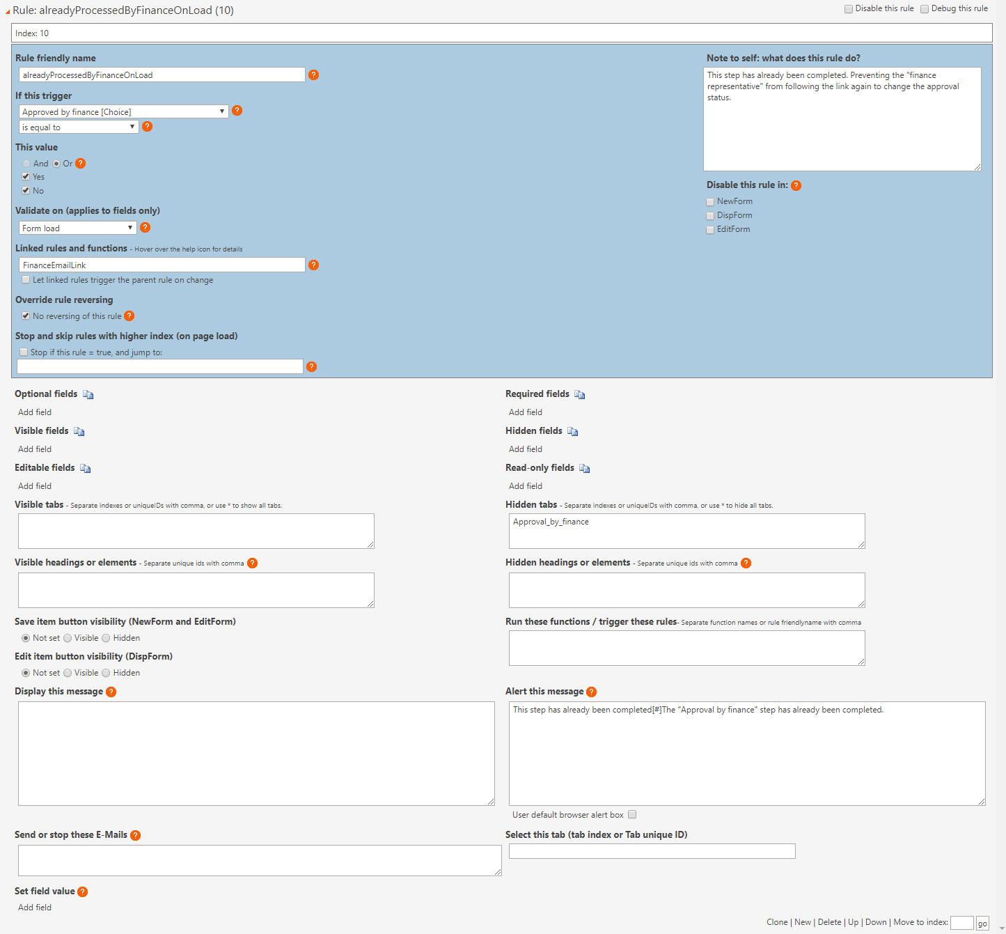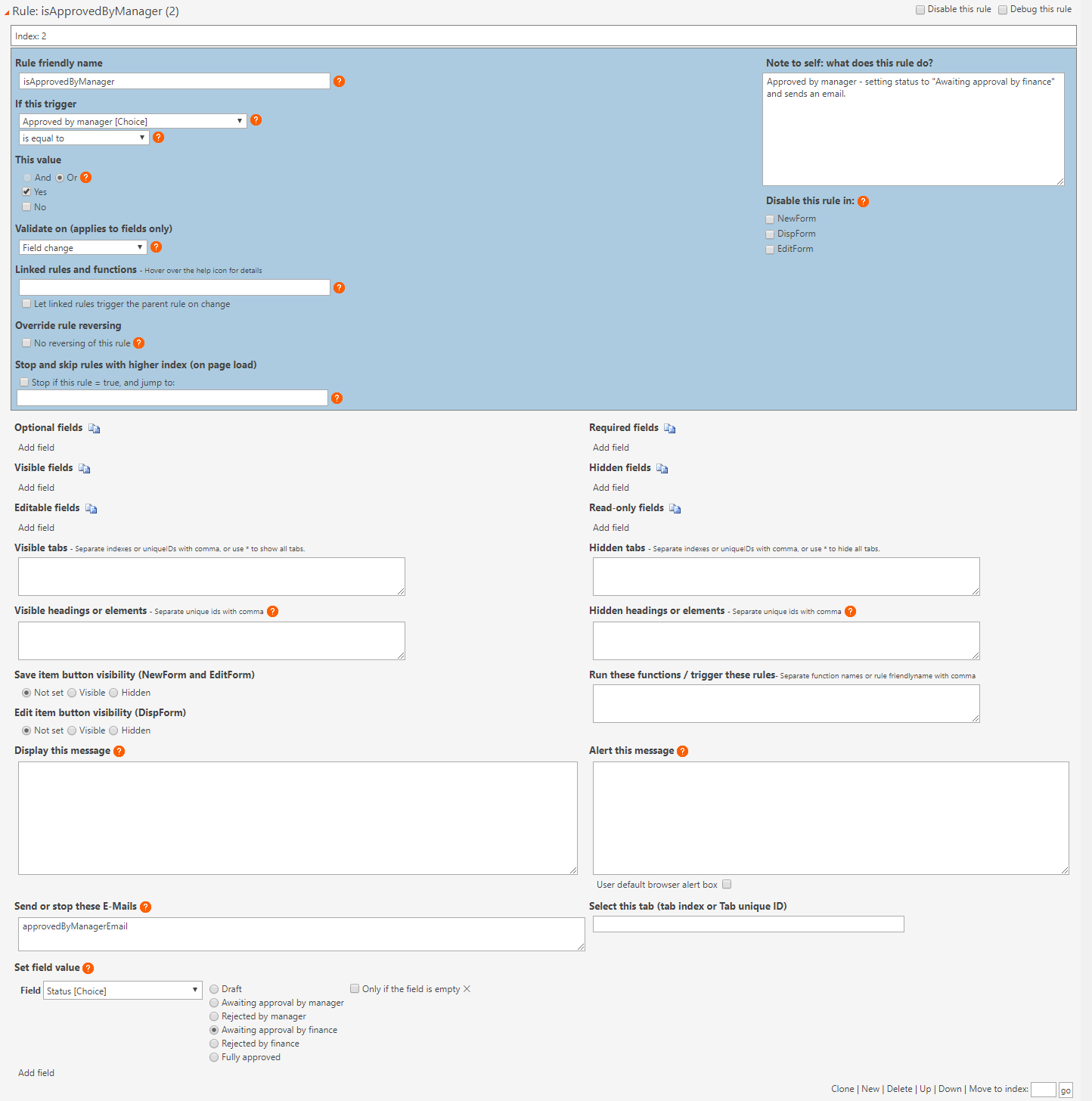 In the tabs Approval_by_manager and Approval_by_finance the rules ManagerEmailLinks respectivily FinanceEmailLink ar not working properly: The Comment field is not marked as required. The rule is correcty implemented for the fields Approved_by_Manager and Approved_by_Finance.