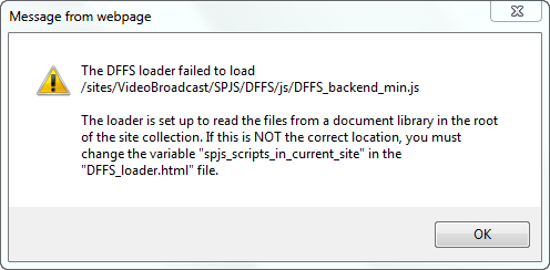 I have installed the Sept. 21, 2016 version at the top level site of a site that has a license that is supposed to work for the entire site collection. Everything setup and works perfectly, but when I go to edit the form on a page that I used the loader to add the CEWPs, I am getting this error message right before I get into the configuration. Everything works as expected, I am able to edit configuration and save with no issues, but I’m not sure why I am getting this error when my files are in the location the error says they are not in.